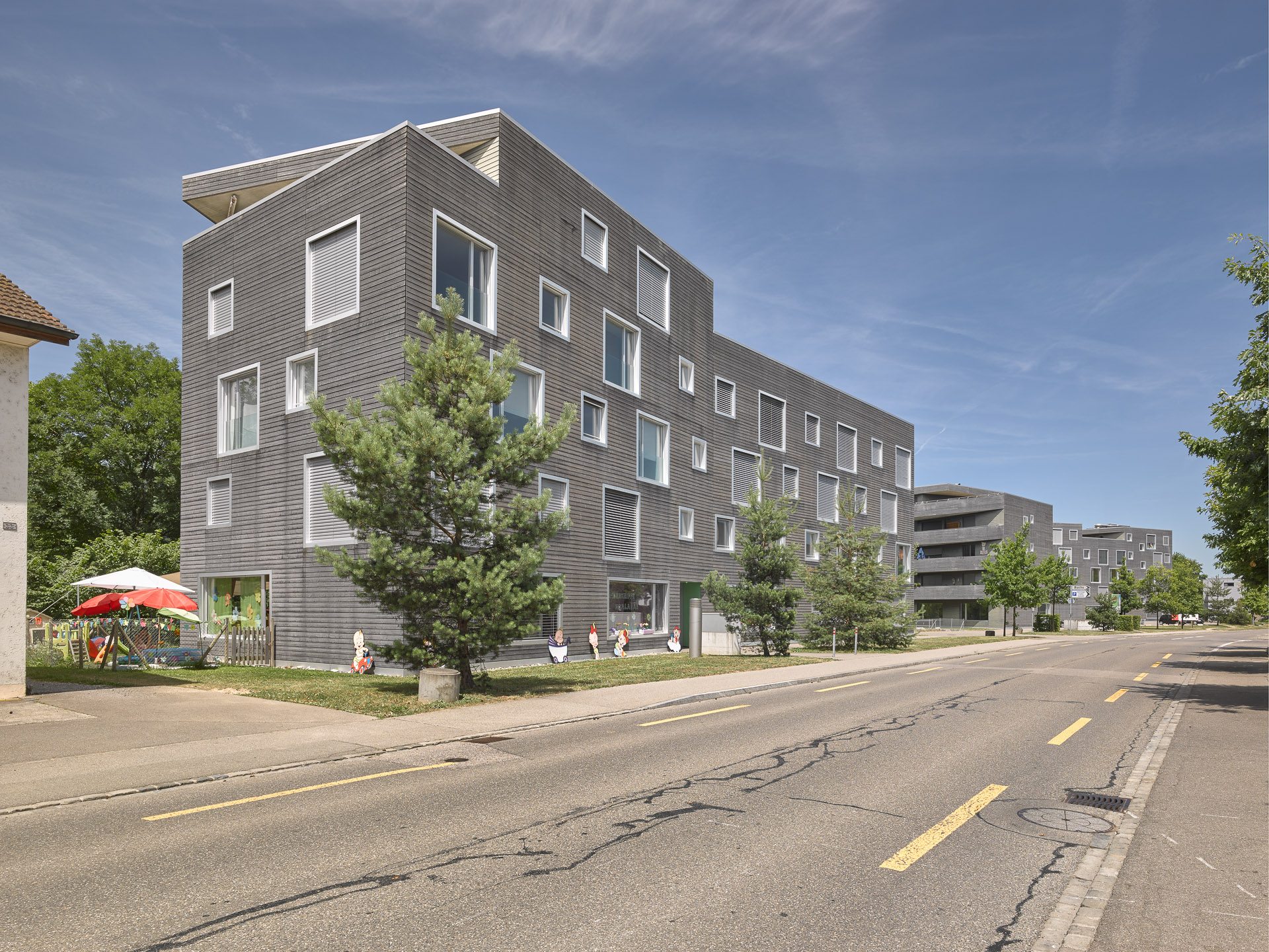 Die Wohn- und Gewerbeüberbauung Quellenpark setzt an der Randlage zwischen Natur und Siedlungsraum einen unübersehbaren architektonischen Akzent. Gegenüber der besiedelten Umgebung treten die Holz-Fassaden als glatte Flächen in Erscheinung, die durch eine unkonventionelle Anordnung der Fenster durchbrochen werden. Zur Waldseite hin lösen sich die Fassaden in Balkonschichten auf.